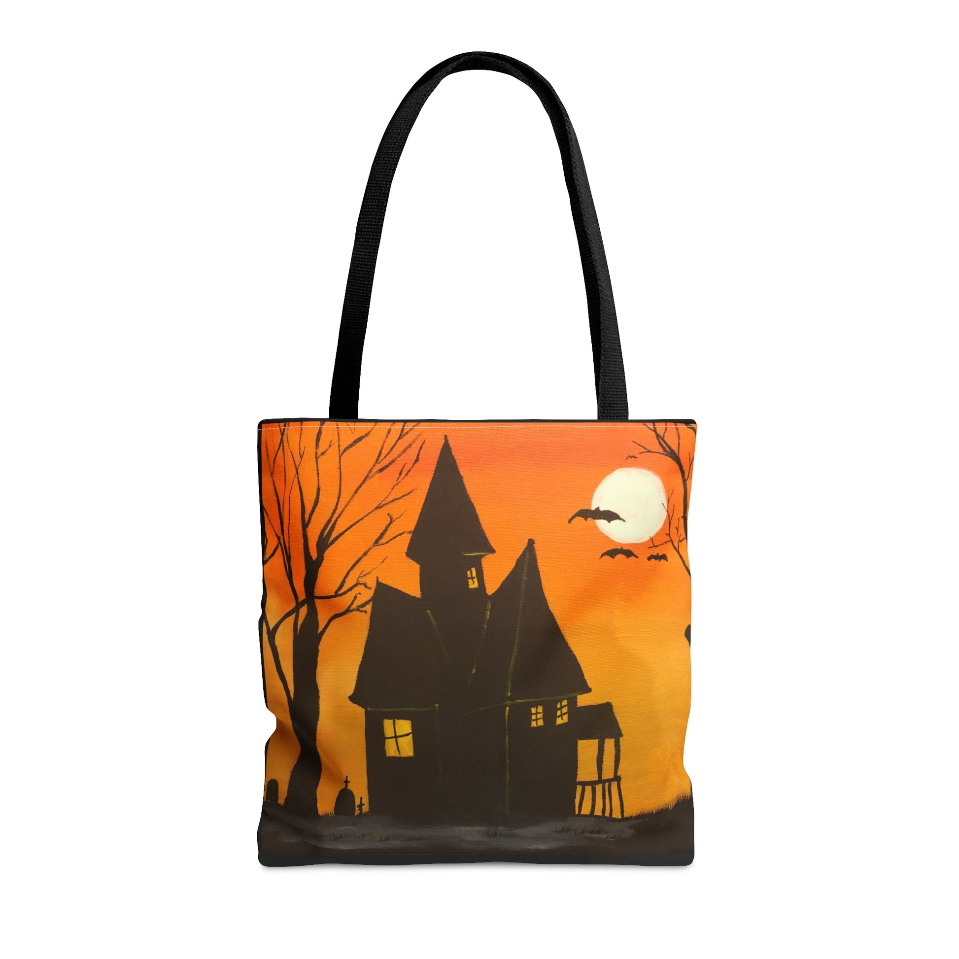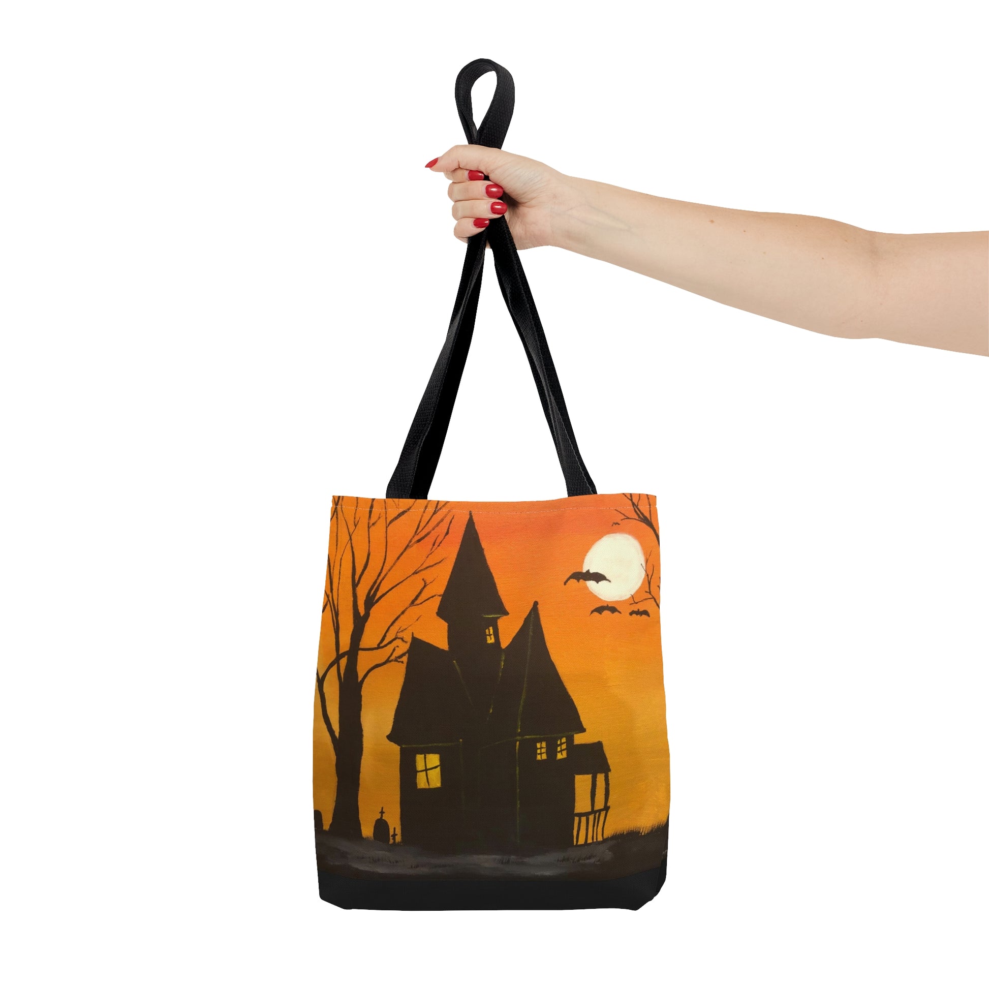 Beneath an orange-hued moon, a stark, looming shadow of a house stretches across the tranquil night. The eerie contrast between the obsidian silhouette and the otherworldly, pumpkin-colored sky sets a hauntingly enchanting scene, invoking the spirit of Halloween and its mysterious allure. This practical, high-quality tote bag is available in three sizes for your Halloween candy. Reuse the bag year after year.
