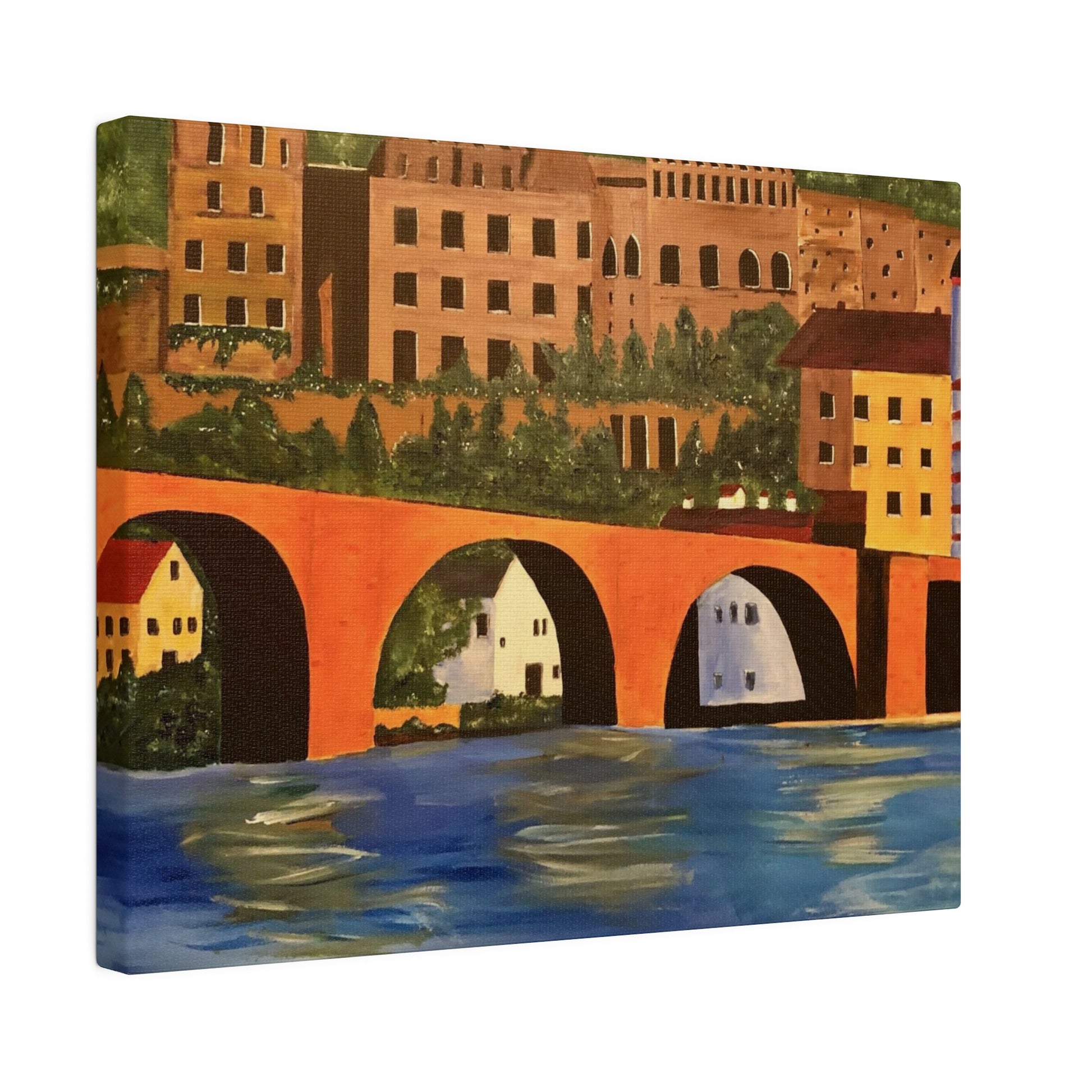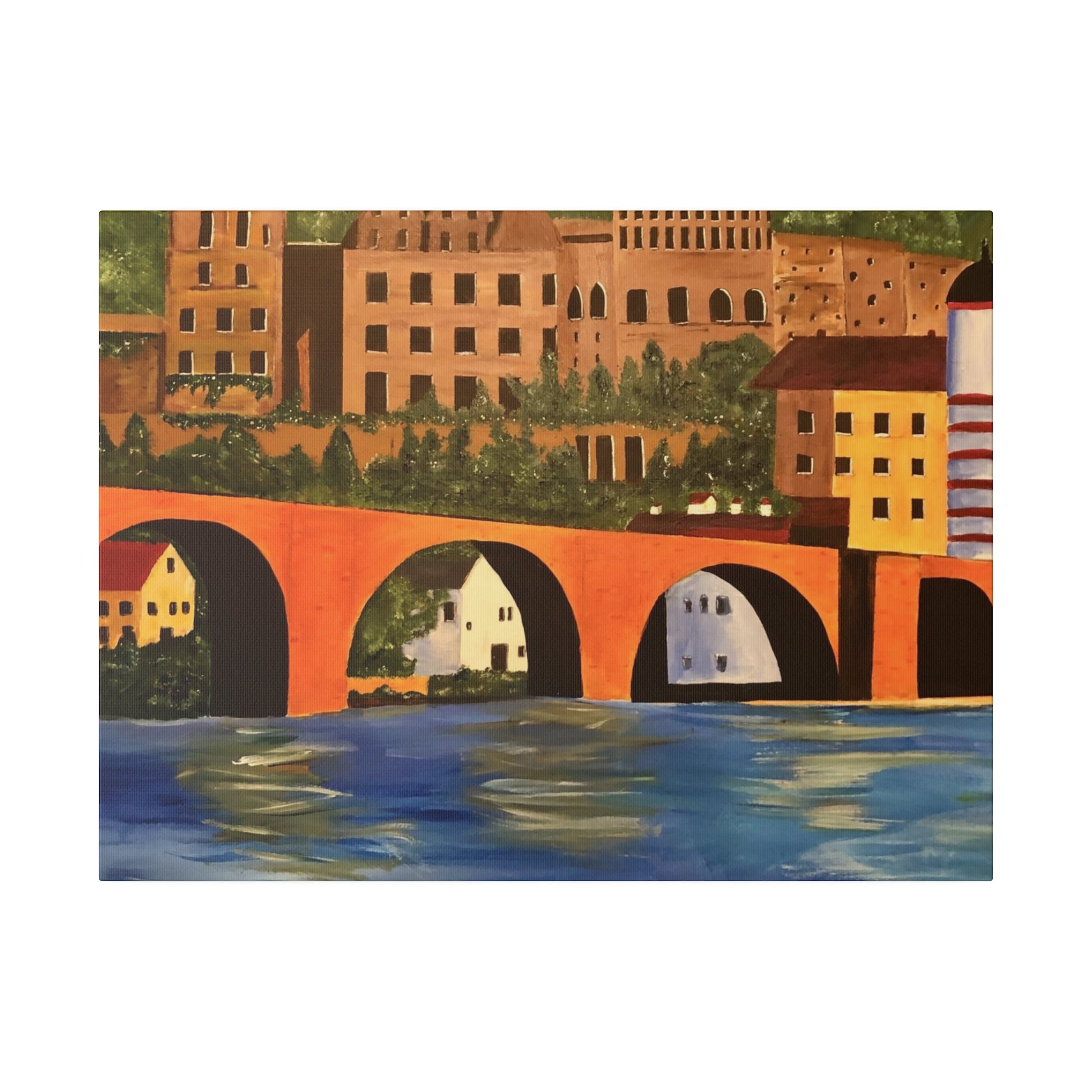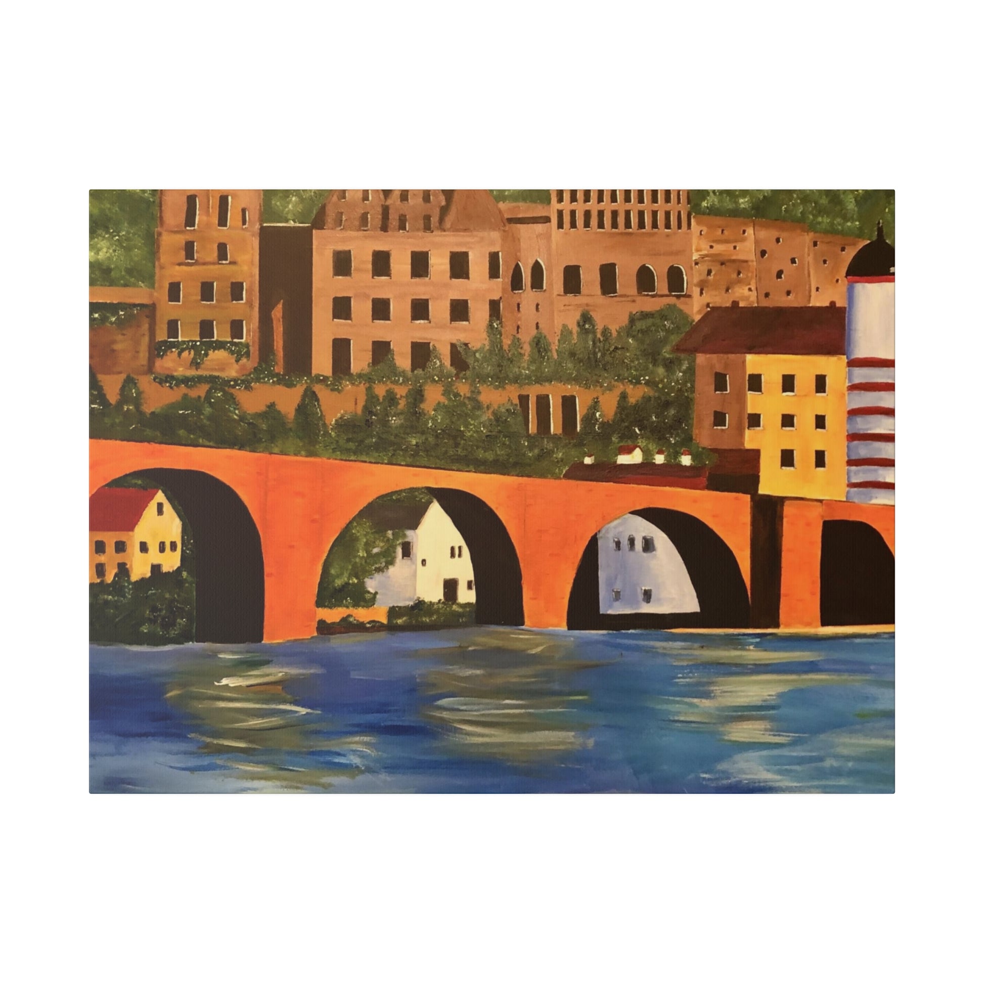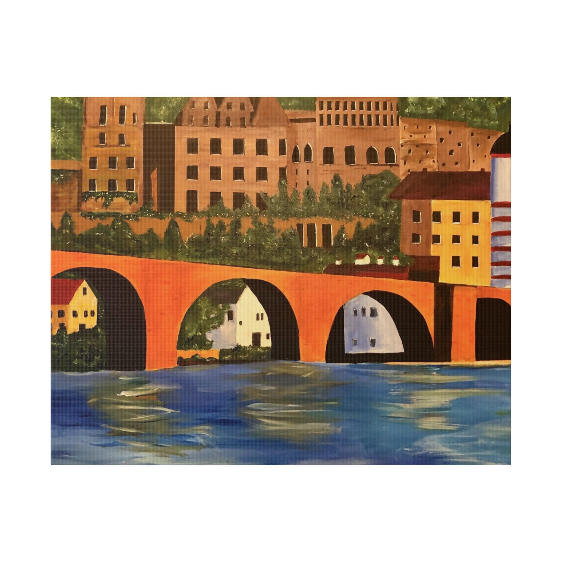 The Karl-Theodor Bridge in Heidelberg, Germany, spans the picturesque Neckar River, with the magnificent Schloss Castle serving as a breathtaking backdrop. This vibrant bridge captures the essence of the serene town of Heidelberg, making it a perfect artistic representation of the area.