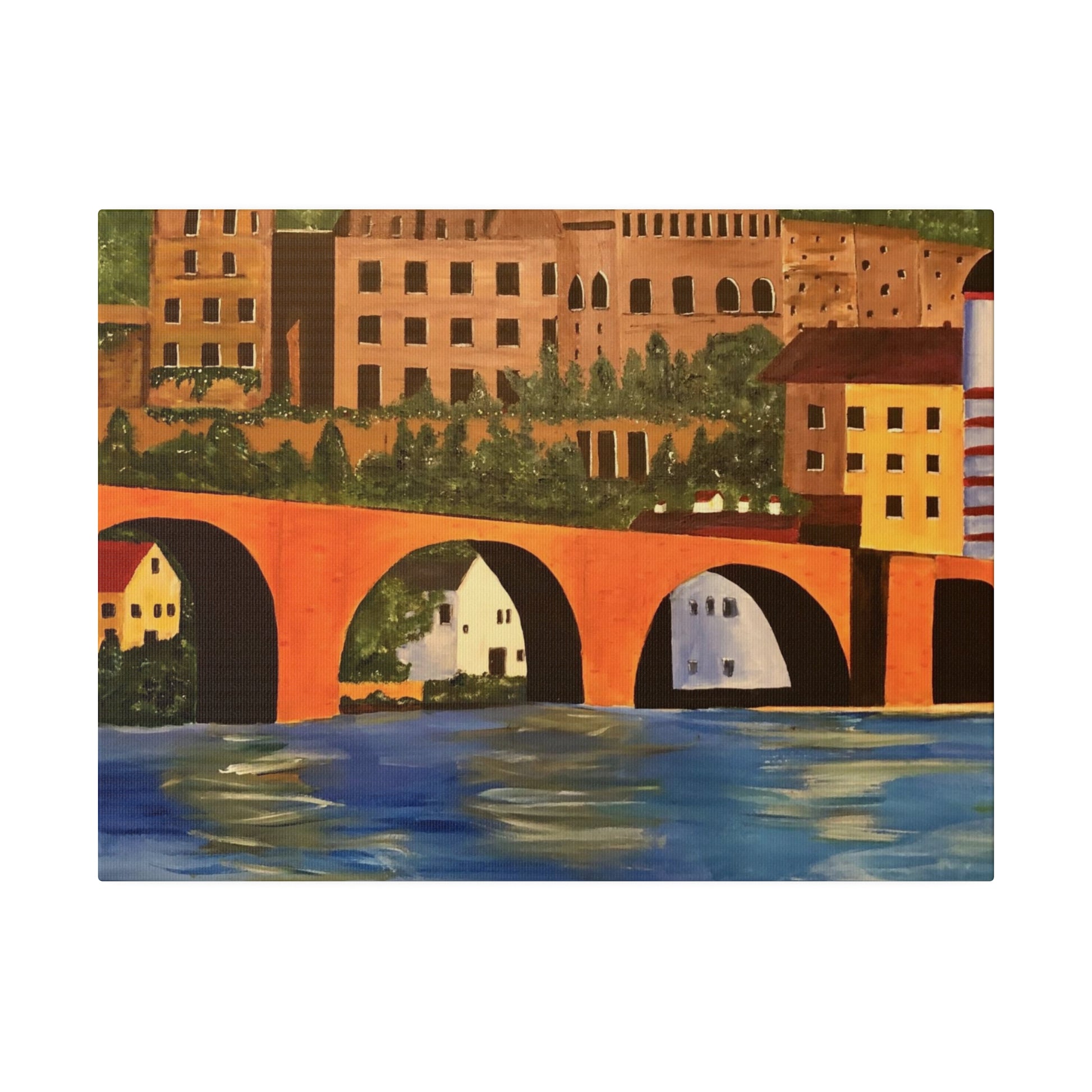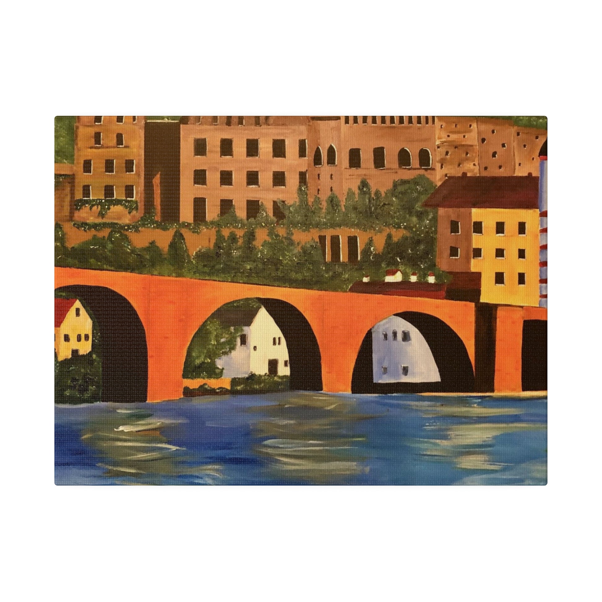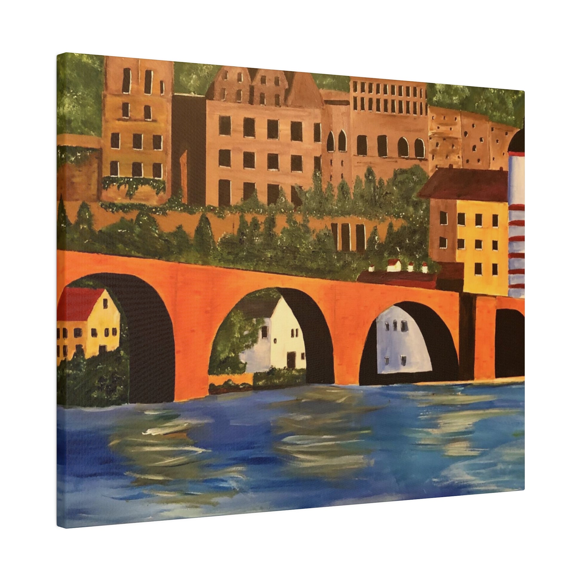 The Karl-Theodor Bridge in Heidelberg, Germany, spans the picturesque Neckar River, with the magnificent Schloss Castle serving as a breathtaking backdrop. This vibrant bridge captures the essence of the serene town of Heidelberg, making it a perfect artistic representation of the area.