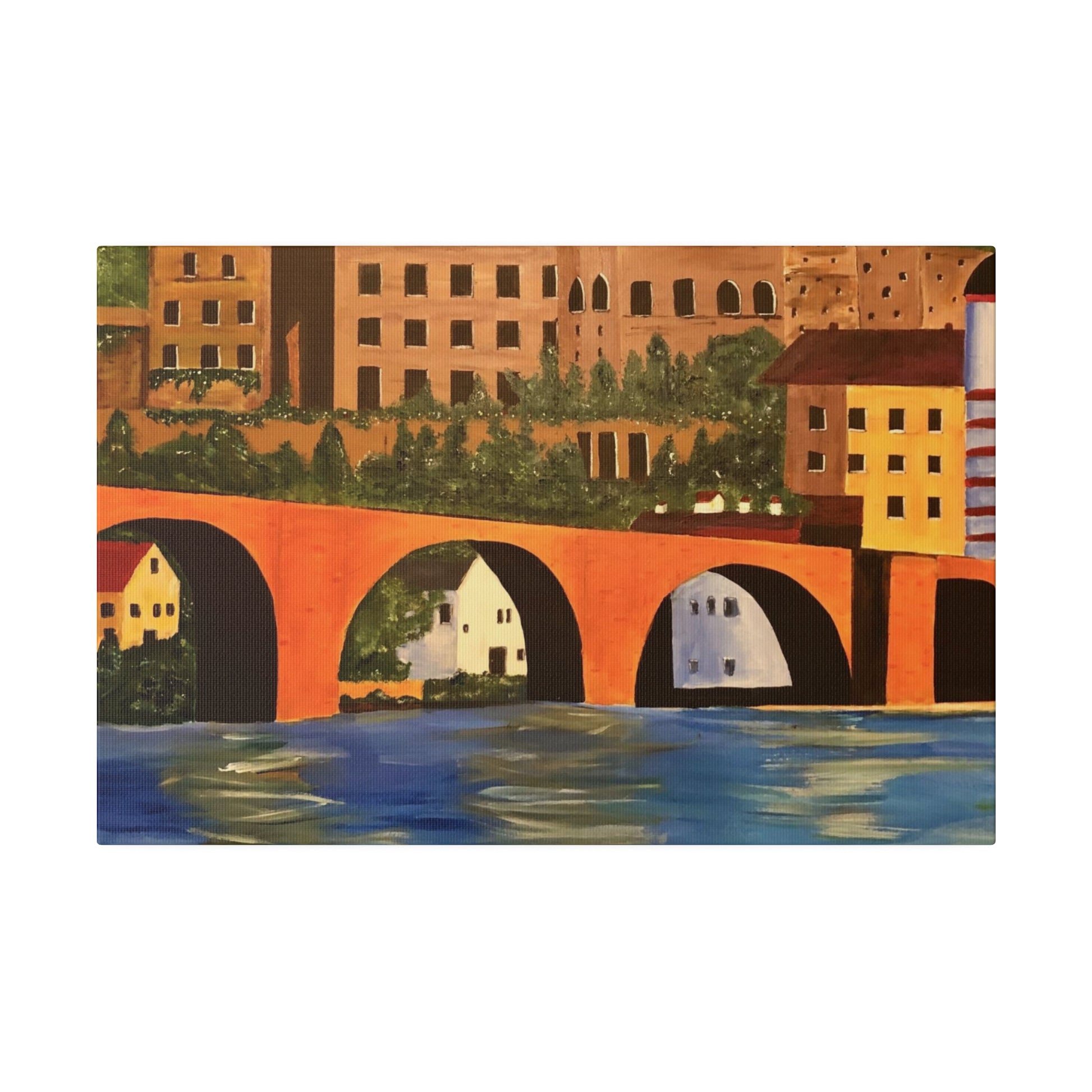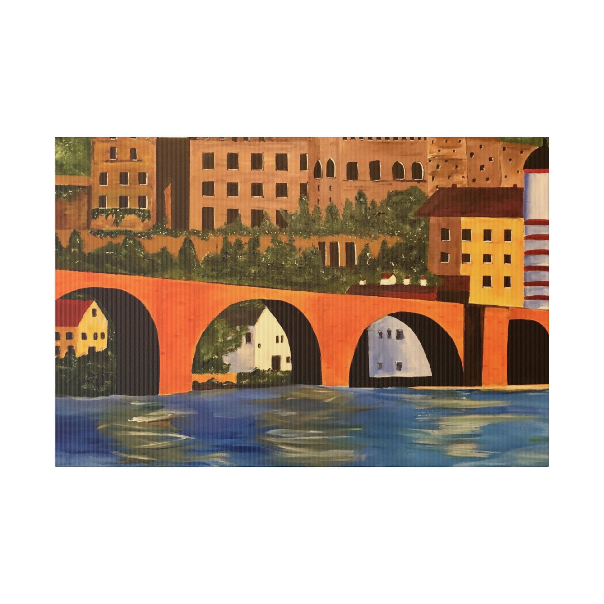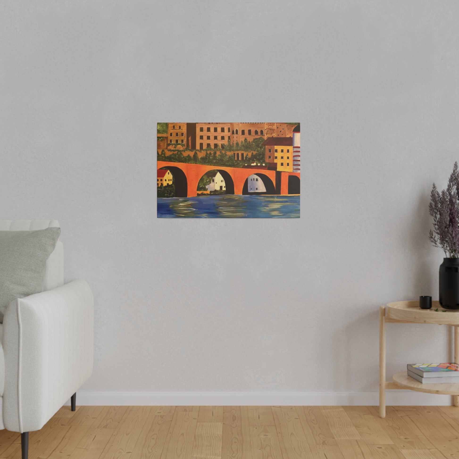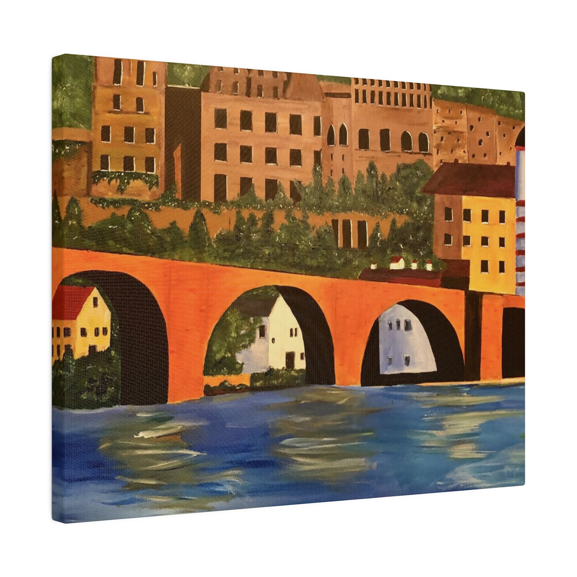 The Karl-Theodor Bridge in Heidelberg, Germany, spans the picturesque Neckar River, with the magnificent Schloss Castle serving as a breathtaking backdrop. This vibrant bridge captures the essence of the serene town of Heidelberg, making it a perfect artistic representation of the area.