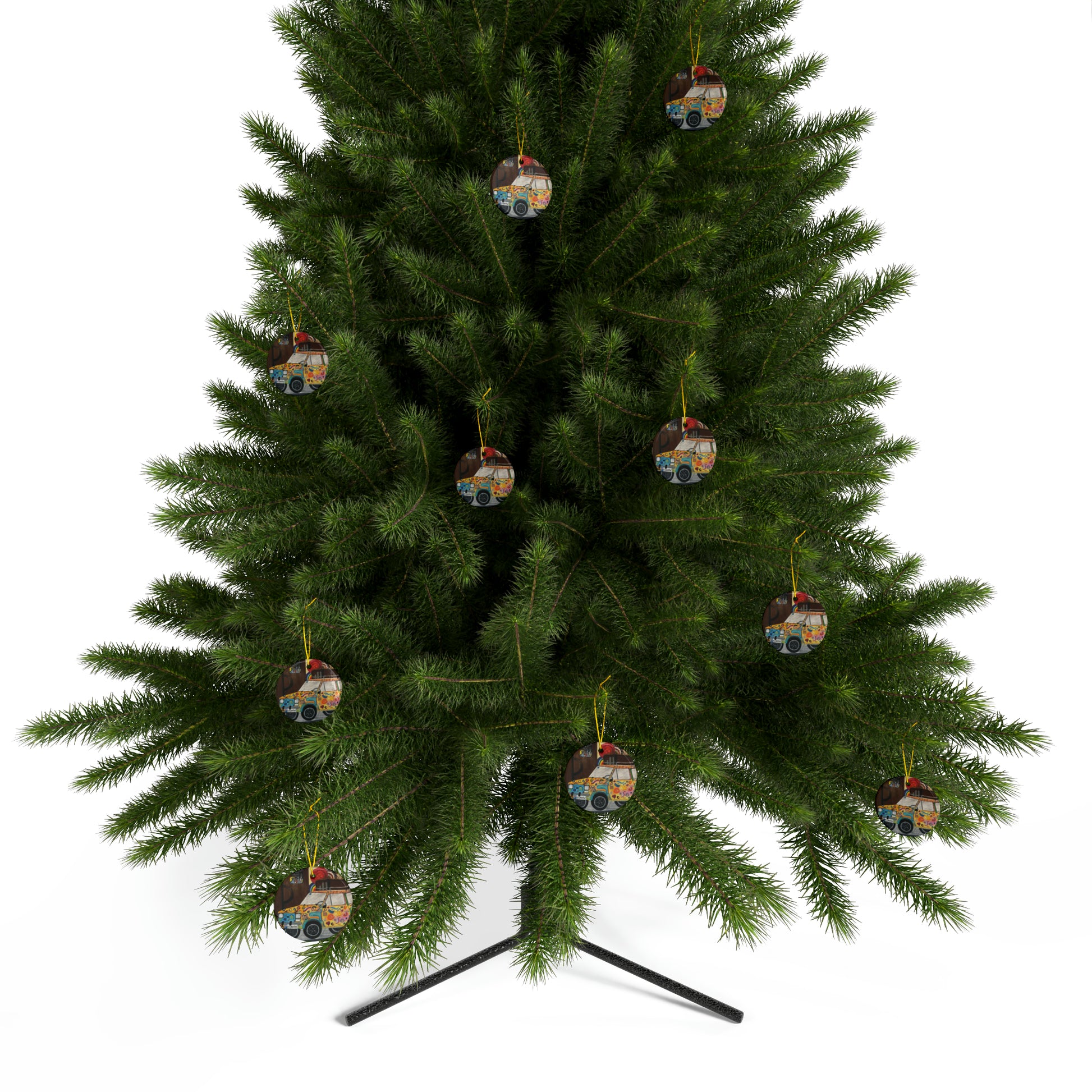 Made with durable ceramic, these ornaments feature a two-sided print.