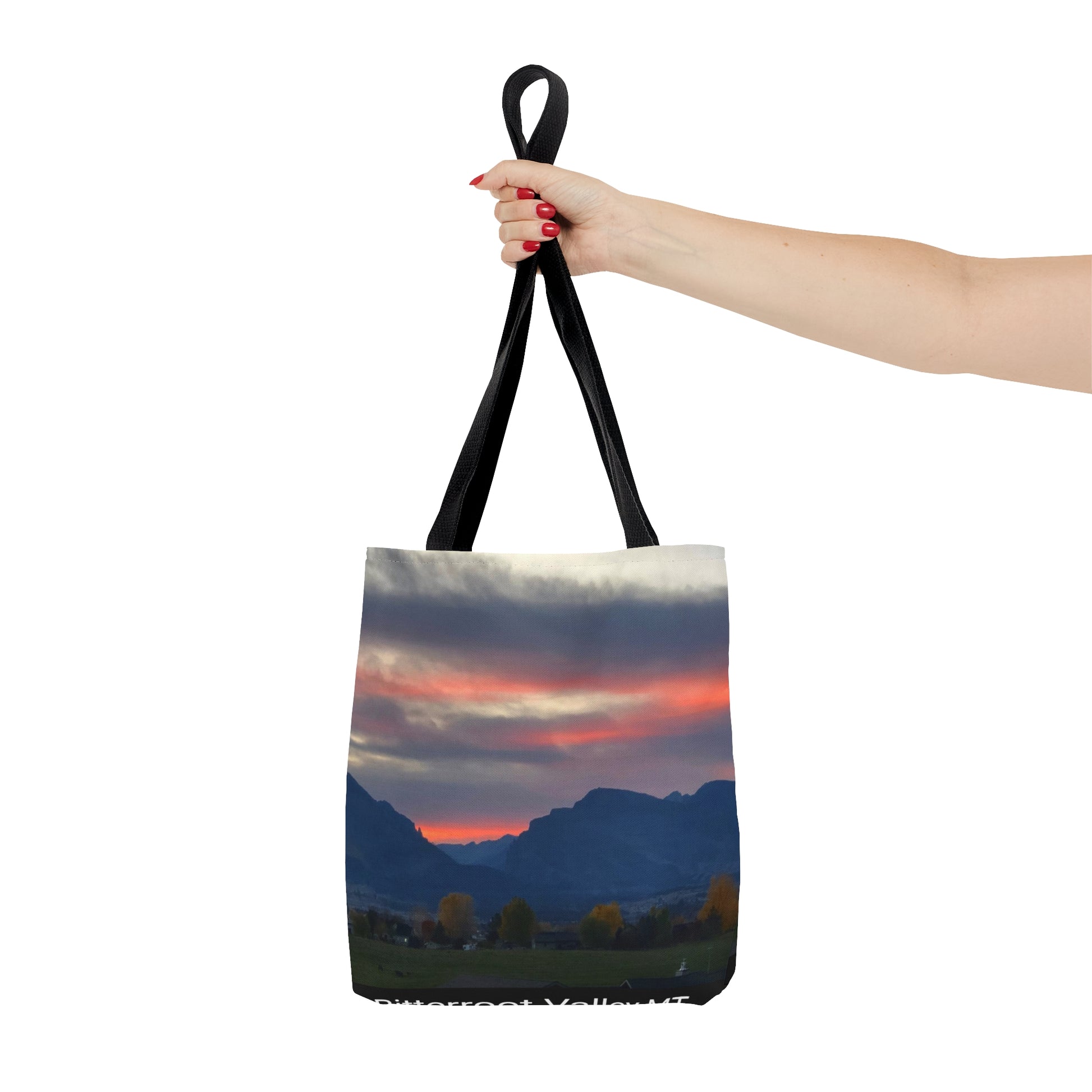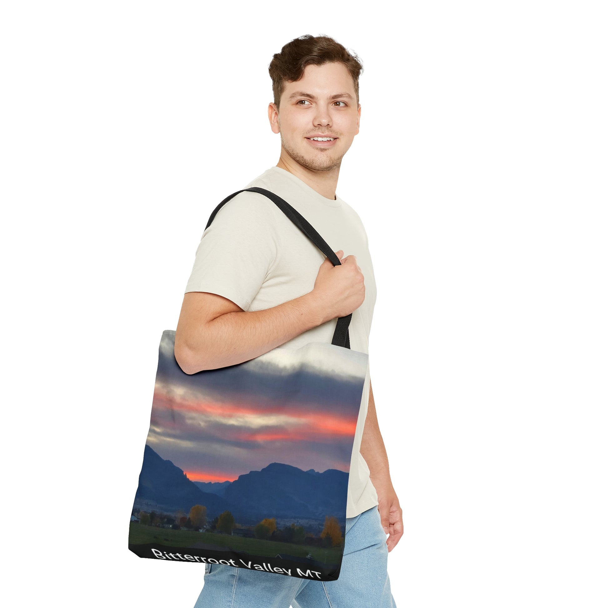In the Bitterroot Valley, Montana, the sunset is a breathtaking spectacle. A vivid tapestry of warm, russet hues paints the sky as the sun dips below the rugged silhouette of the Rocky Mountains. The landscape is bathed in a golden glow, and the tranquil valley whispers its goodnight in serene, awe-inspiring beauty.